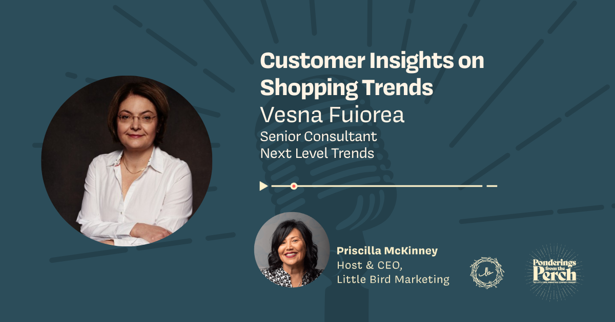 On this episode of Ponderings from the Perch, the Little Bird Marketing podcast, host and CEO Priscilla McKinney sits down with Vesna Fuiorea, Senior Consultant at Next Level Trends, to examine why shopper behavior operates on an entirely different frequency than consumer behavior. Vesna brings over 20 years of experience in consumer goods to a conversation that challenges assumptions about how people make purchasing decisions when time, emotion, and mission collide at the point of sale.
