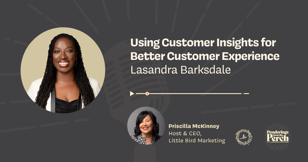 On this episode of Ponderings from the Perch, host and Little Bird Marketing CEO Priscilla McKinney talks with Lasandra Barksdale, Founder and Principal at Kompass Customer Solutions about using customer insights to improve customer experience (CX). They examine how service-driven businesses often excel at marketing and sales but fail at the handoffs, workflows, and internal processes that determine whether customers stay or leave. Barksdale talks about her work helping companies transform support tickets, online reviews, and frontline feedback into actionable customer insights to create a clear roadmap for removing friction from the customer journey. And that is the crux of great CX!