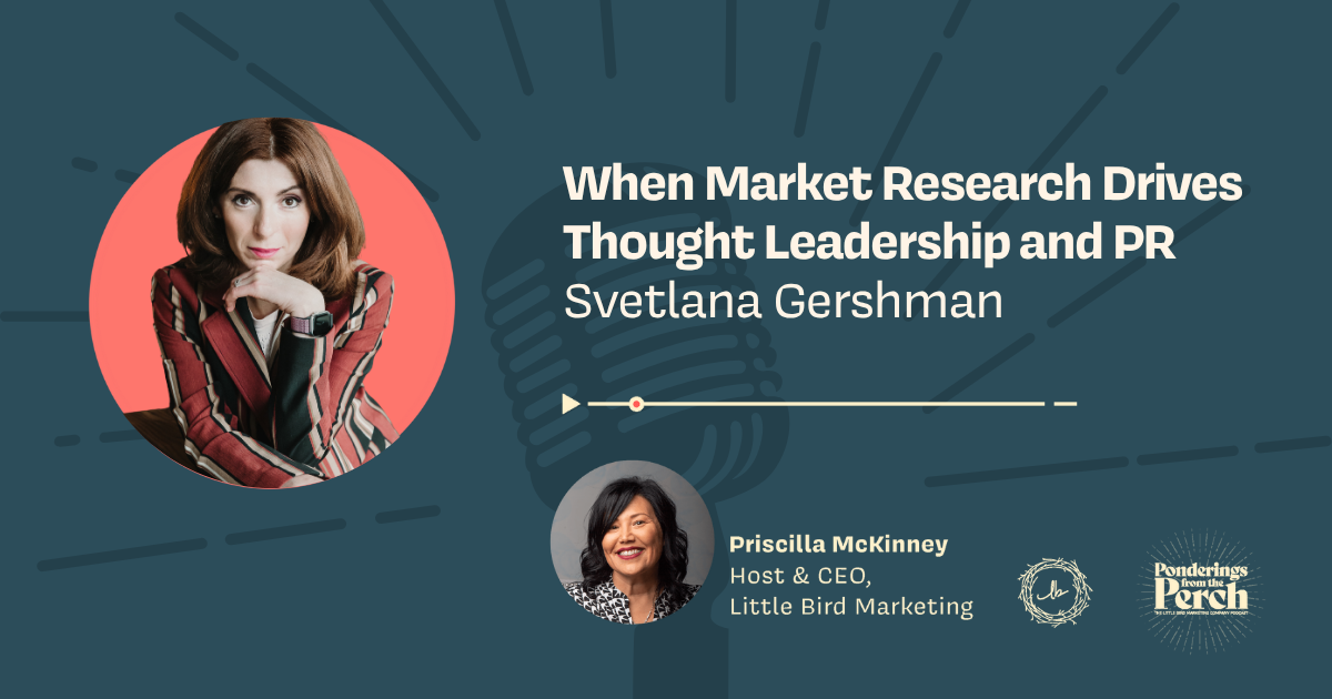 On this episode of Ponderings from the Perch, the Little Bird Marketing podcast, host and CEO Priscilla McKinney talks with guest and Senior Vice President of Marketing Research at Method Communications, Svetlana Gershman, about how market research and PR must work together to create authentic thought leadership. They explore why these disciplines historically operated in silos and how the rise of large language models (LLMs) is forcing communication teams to unify around consistent narratives that build expertise, authority, and trustworthiness.